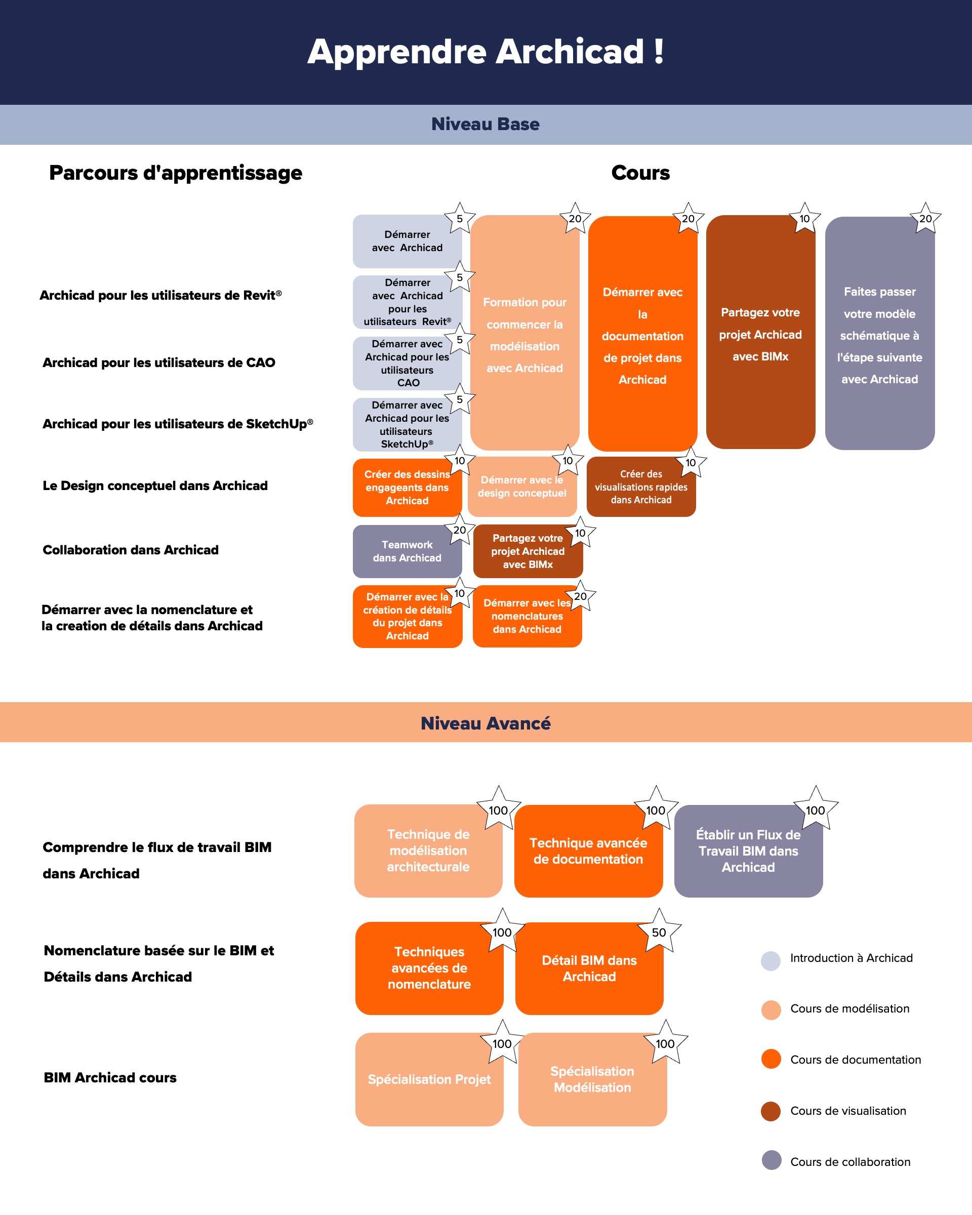 Une fois que vous aurez acheté le programme Apprendre Archicad !, vous accéderez instantanément à tous les cours en ligne, organisés selon les parcours d'apprentissage présentés ci-dessous :
